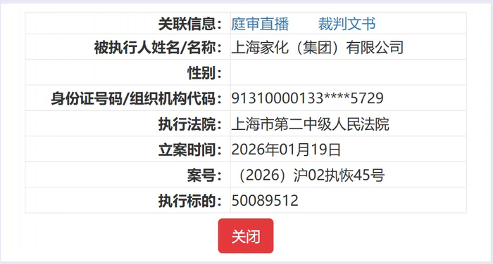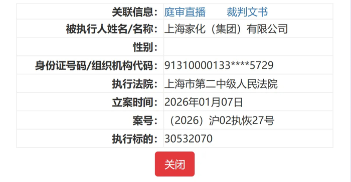 另一起案件案号为(2026)沪02执恢27号,于今年1月7日恢复执行,执行金额为3053.21万元,该案被执行人仅上海家化集团一家。