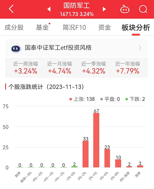 中国经济网北京11月13日讯 今日,国防军工板块整体涨幅3.24%,其中,138只股票上涨,0只股票平盘,2只股票下跌。