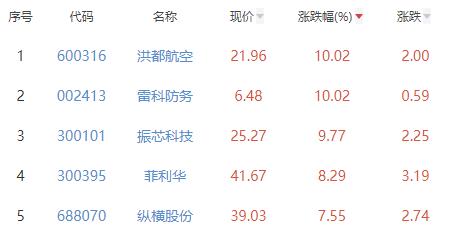 其中,洪都航空、雷科防务、振芯科技、菲利华、纵横股份位列板块涨幅前五位,涨幅分别为10.02%、10.02%、9.77%、8.29%、7.55%。