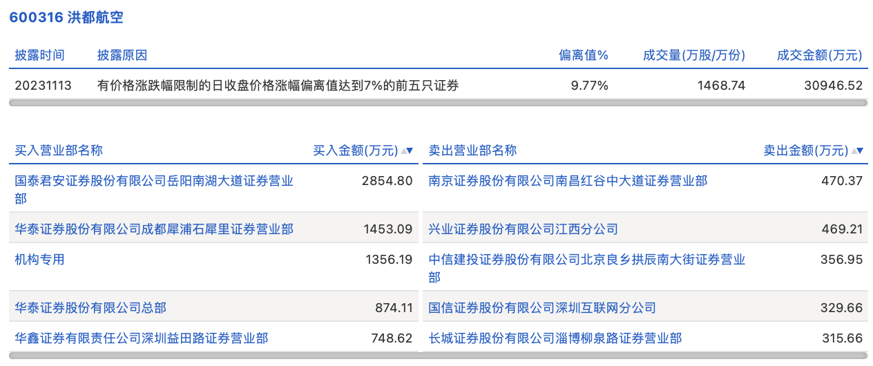 11月13日,洪都航空今日涨停,全天换手率达2.05%,振幅达10.32%。龙虎榜数据显示,营业部席位合计净买入5344.94万元。其中,机构合计净买入1356.19万元。此外,国泰君安证券岳阳南湖大道证券营业部、华泰证券成都犀浦石犀里证券营业部分别买入2854.80万元、1453.09万元;南京证券南昌红谷中大道证券营业部、兴业证券江西分公司分别卖出470.37万元、469.21万元。