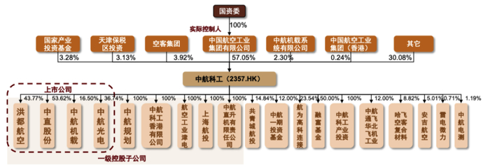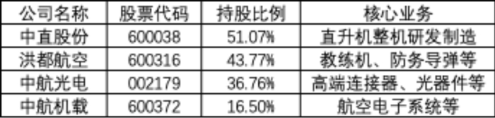 中航科工下设共9家一级子公司,其中包括中直股份、中航机载、洪都航空、中航光电4家上市公司: