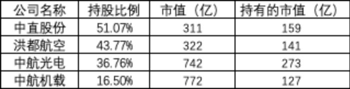 从这个角度,我们可以把中航科工的市值当成是四家子公司市值乘上对应股权比例的求和,即假设其他非上市公司市值可忽略不计,加权求和后市值合计为700亿。