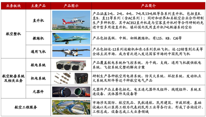 战略布局三大业务,主要产品涵盖直升机、教练机、通用飞机、机载系统与航空零部件、航空工程服务等。