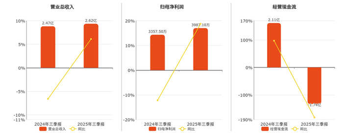 公司营业总收入为2.62亿元。归母净利润为3987.10万元。经营活动现金净流入为-1.74亿元,较去年同报告期经营活动现金净流入减少3.85亿元,同比较去年同期下降182.48%。