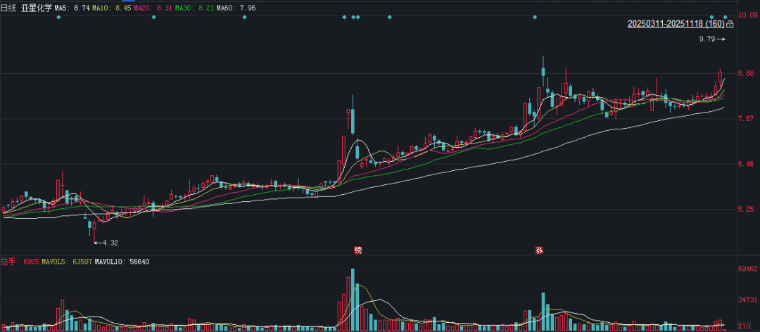11月17日晚间,亚星化学发布公告称,公司股票于11月18日开市起复牌。截至11月18日9时45分,公司股票开盘后涨停封板报9.79元/股,今年来股价已翻倍。