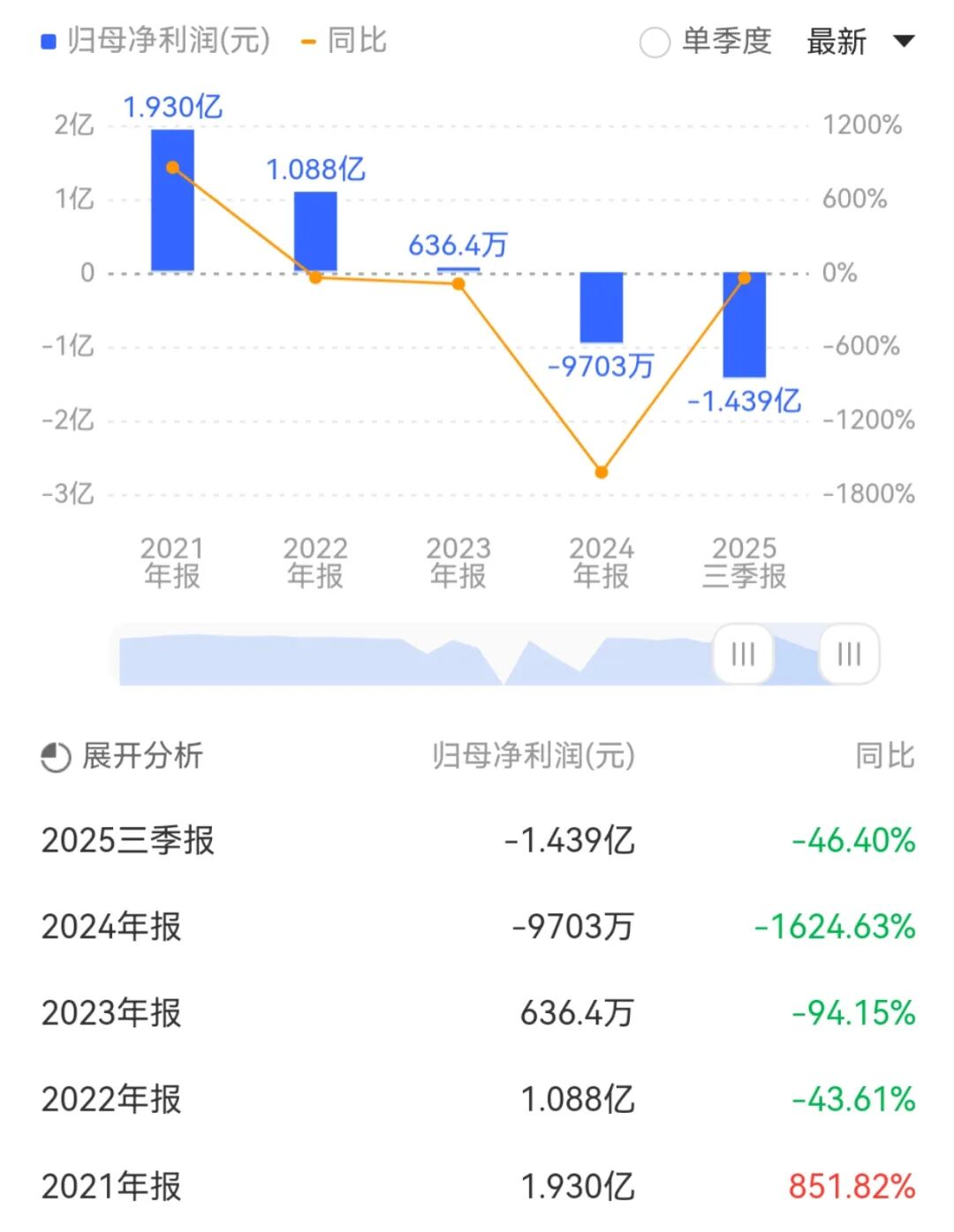 2025年前三季度,公司实现营业总收入6.41亿元,同比下降2.53%;归母净利润亏损1.44亿元,上年同期亏损9830.81万元;扣非净利润亏损1.44亿元,上年同期亏损1.06亿元。