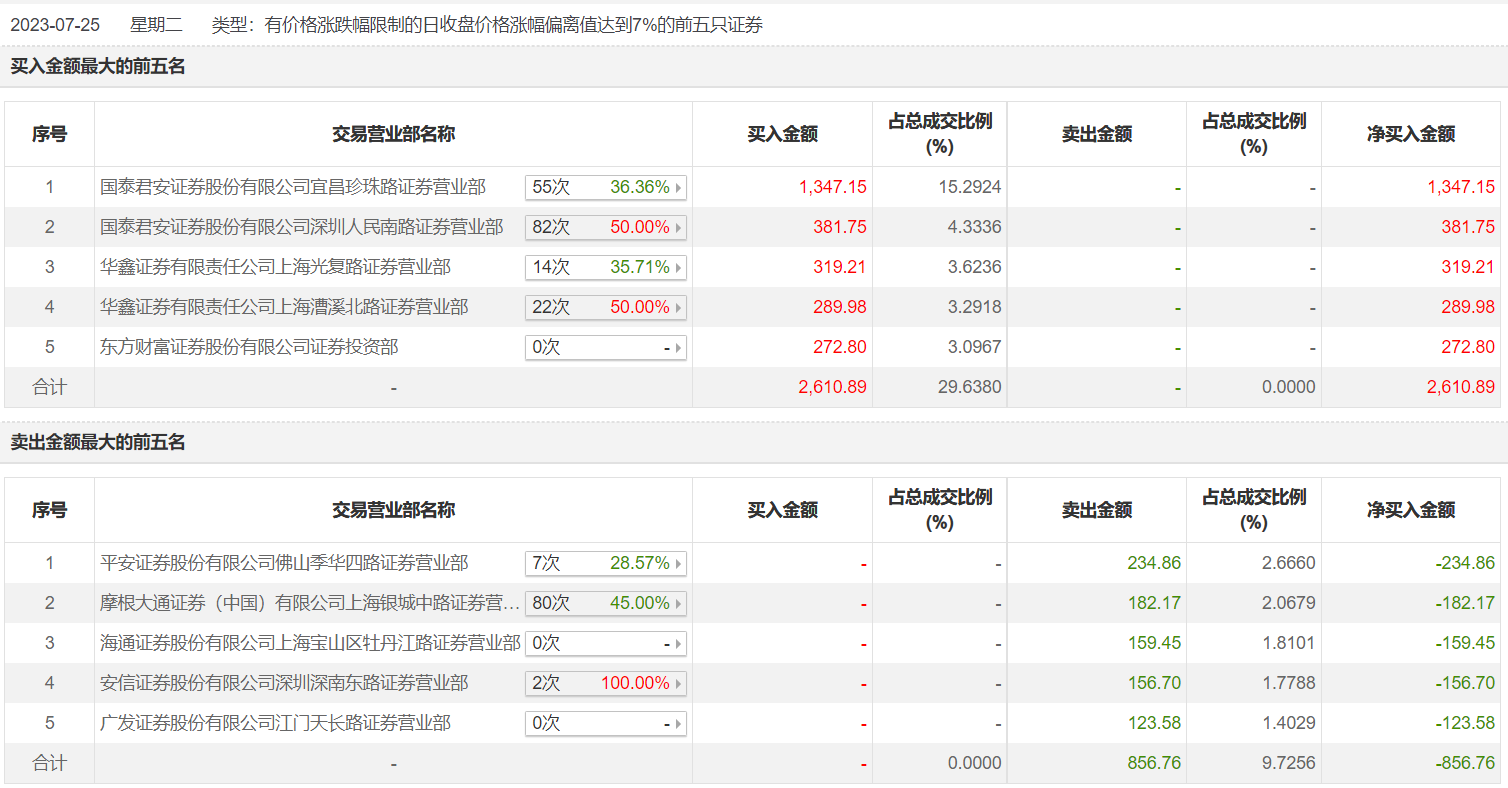 具体来看,国泰君安证券宜昌珍珠路证券营业部、国泰君安证券深圳人民南路证券营业部分别买入1347.15万元、381.75万元;平安证券佛山季华四路证券营业部、摩根大通上海银城中路证券营业部分别卖出234.86万元、182.17万元。