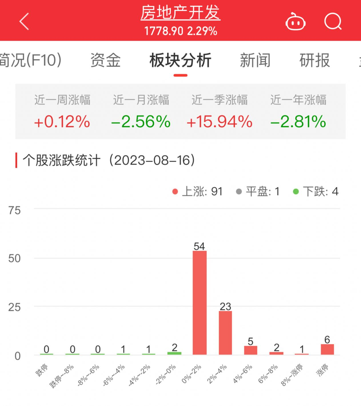 中国经济网北京8月16日讯 今日,房地产开发板块整体涨幅2.29%,其中91只股票上涨,1只股票平盘,4只股票下跌。