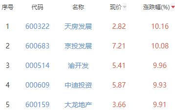 其中,天房发展、京投发展、渝开发、中迪投资、大龙地产位列板块涨幅前五位,涨幅分别为10.16%、10.08%、9.96%、9.93%、9.91%。
