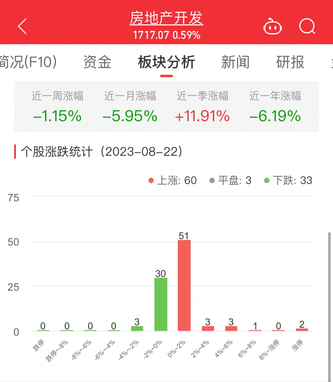 中国经济网北京8月22日讯 今日,房地产开发板块整体涨幅0.59%,其中60只股票上涨,3只股票平盘,33只股票下跌。