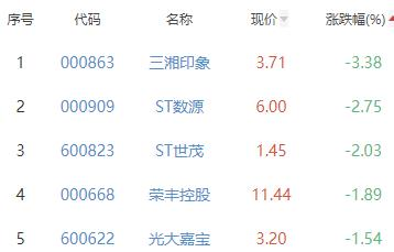 三湘印象、ST数源、ST世茂、荣丰控股、光大嘉宝位列涨幅榜后五位,涨幅分别为-3.38%、-2.75%、-2.03%、-1.89%、-1.54%。