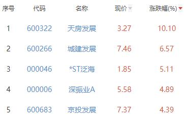 其中,天房发展、城建发展、*ST泛海、深振业A、京投发展位列板块涨幅前五位,涨幅分别为10.10%、6.57%、5.11%、4.89%、4.39%。