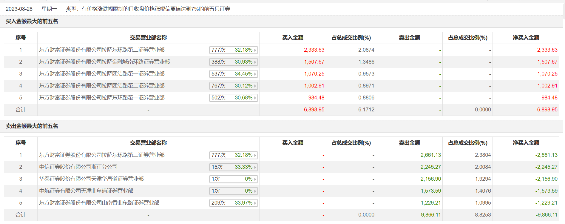 具体来看,东方财富证券拉萨东环路第二证券营业部、东方财富证券拉萨金融城南环路证券营业部分别买入2333.63万元、1507.67万元;东方财富证券拉萨东环路第二证券营业部、中信证券浙江分公司分别卖出2661.13万元、2245.27万元。