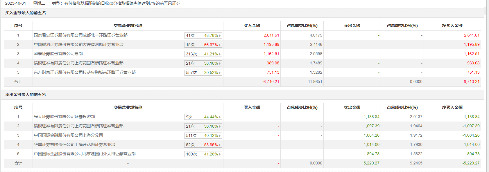 10月31日,津投城开今日涨停,全天换手率达19.98%,振幅达14.92%。龙虎榜数据显示,营业部席位合计净买入1480.95万元。其中,国泰君安证券成都北一环路证券营业部、中国银河证券大连黄河路证券营业部分别买入2611.61万元、1195.89万元;光大证券证券投资部、瑞银证券上海花园石桥路证券营业部分别卖出1138.84万元、1097.39万元。