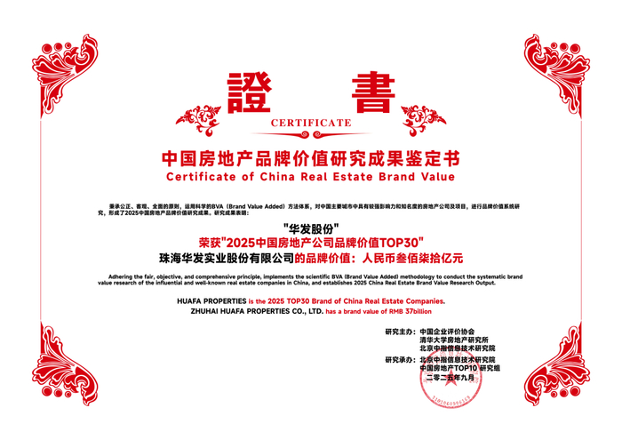 2025年9月11日,由中国企业评价协会、清华大学房地产研究所、北京中指信息技术研究院主办,北京中指信息技术研究院中国房地产TOP10研究组承办的“2025中国房地产品牌价值研究成果发布会暨第二十二届中国房地产品牌发展论坛”在北京国家会议中心隆重召开。华发股份凭借雄厚的综合实力以及不断攀升的品牌价值,荣获“2025中国房地产公司品牌价值TOP30”。