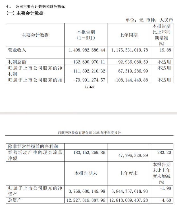 西藏天路8月18日晚间披露2025年半年报,公司上半年实现营业收入14.09亿元,同比增长19.88%;归母净利润为-1.12亿元,上年同期亏损6731.93万元;基本每股收益-0.0846元。