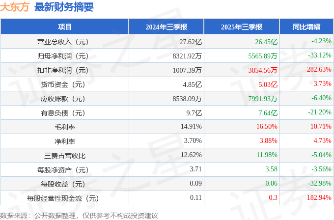 据证券之星公开数据整理,近期大东方(600327)发布2025年三季报。截至本报告期末,公司营业总收入26.45亿元,同比下降4.23%,归母净利润5565.89万元,同比下降33.12%。按单季度数据看,第三季度营业总收入8.4亿元,同比下降2.07%,第三季度归母净利润-337.88万元,同比上升86.36%。本报告期大东方短期债务压力上升,流动比率达0.64。