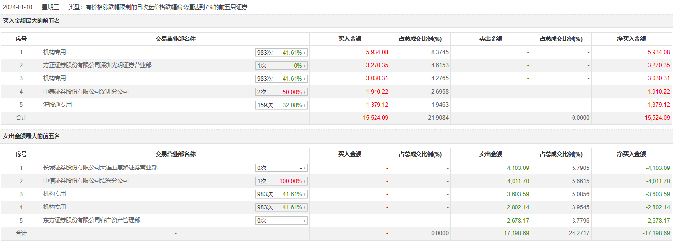 达仁堂1月10日跌停,全天换手率达3.88%,振幅达8.62%。龙虎榜数据显示,营业部席位合计净卖出1674.6万元。其中,机构买入8964.39万元,卖出6405.73万元,合计净买入2558.66万元。此外,长城证券大连五惠路证券营业部、中信证券绍兴分公司分别卖出4103.09万元、4011.70万元;方正证券深圳光明证券营业部、中泰证券深圳分公司分别买入3270.35万元、1910.22万元。