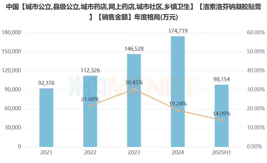 根据米内数据库显示,近年来洛索洛芬钠凝胶贴膏销售规模持续快速增长,2024年国内总销售额为17.47亿元,同比增长近20%,2025年上半年国内总销售额已达9.81亿元。