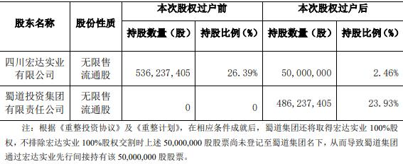 2024年7月19日,四川省什邡市人民法院裁定批准了《重整计划》。根据《重整计划》,重整投资人蜀道集团将承接宏达实业持有的公司536,237,405股股票,占公司总股本的比例为26.39%。截至预案公告日,上述股票中的486,237,405 股(占公司总股本的比例为23.93%)已登记至蜀道集团名下,另外50,000,000股质押股票享有优先受偿权的有财产担保债权因涉诉暂缓确认,暂未完成交割,但鉴于蜀道集团已取得宏达实业100%股权,从而通过宏达实业间接持有上述50,000,000股股票。综上,蜀道集团已直接和间接合计持有公司26.39%股份,成为公司控股股东,四川省政府国有资产监督管理委员会成为公司的实际控制人。