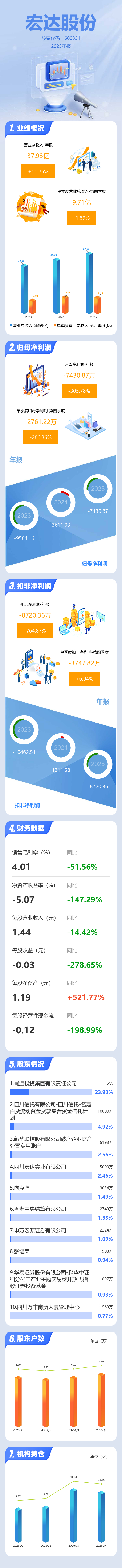 证券之星消息,宏达股份2025年年报显示,当年度公司主营收入37.93亿元,同比上升11.25%;归母净利润-7430.87万元,同比下降305.78%;扣非净利润-8720.36万元,同比下降764.87%;其中2025年第四季度,公司单季度主营收入9.71亿元,同比下降1.9%;单季度归母净利润-2761.22万元,同比下降286.37%;单季度扣非净利润-3747.82万元,同比上升6.94%;负债率12.99%,投资收益124.45万元,财务费用1801.17万元,毛利率4.01%。