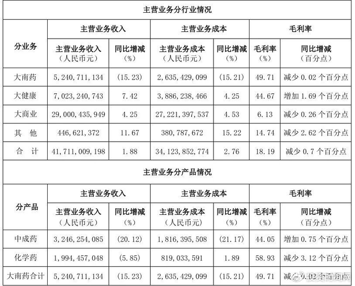 投资时间网、标点财经研究员注意到,上半年,白云山旗下各大业务板块表现各不相同。其中,以王老吉凉茶为核心的大健康业务表现亮眼,期内实现收入70.23亿元,同比增长7.42%;大商业板块保持平稳,收入同比增长4.25%至290亿元;但传统核心业务大南药业绩不佳,整体收入同比下降15.23%至52.41亿元,其中,中成药收入同比大幅下滑20.12%至32.46亿元,化学药收入同比下降5.85%至19.94亿元。