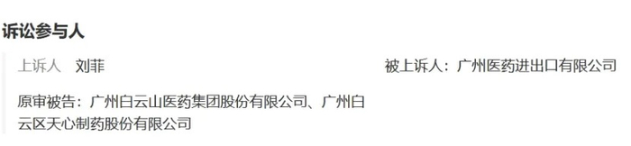 可见,该案上诉人刘菲“2017-2021年1月担任广州医药进出口有限公司副总经理”“2021年2月入职天心制药”履历与白云山财务总监刘菲高度重合。