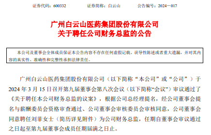 业界的质疑不无理由。2024年3月15日白云山公告称,公司在第九届董事会第八次会议上审议通过了聘任刘菲女士为公司财务总监的议案,任期自董事会审议通过之日起至第九届董事会成员任期届满之日止。