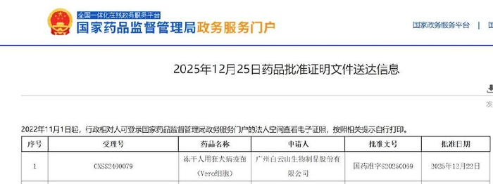 新快报讯12月25日,广州白云山医药集团股份有限公司发布关于广州白云山生物制品股份有限公司(以下简称“白云山生物”)收到药品注册证书的公告,白云山生物正式获得国家药品监督管理局核准签发的“冻干人用狂犬病疫苗(Vero细胞)”《药品注册证书》。此次获批,标志着白云山生物实现了在疫苗产业化领域的重大跨越。