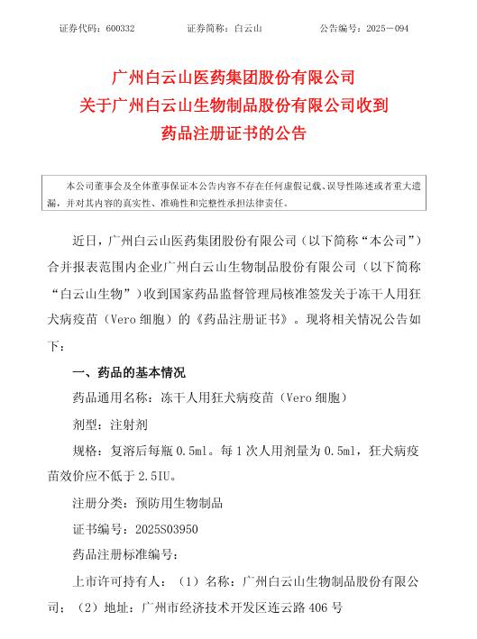 据了解,白云山生物是广药集团旗下生物医药板块重要成员企业,本次冻干人用狂犬病疫苗(Vero 细胞)获批生产,有望成为广药集团在生物制药板块的重要增长点,标志着广药集团在疫苗产业化领域的重大突破,进一步完善从中药、化药到生物药的全产业链布局。作为广州市本土的疫苗企业,白云山生物此次获批生产也有助于提升区域疫苗供应保障能力,为广州市生物医药产业的高质量发展提供有力支撑。