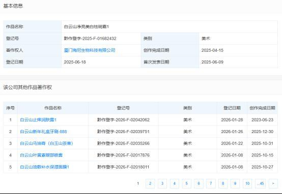 需要说明的是,“白云山净亮美白祛斑霜”的注册人系美颂化妆品持股90%的控股子公司。而福建帮的知名代表企业——厦门海尼生物科技有限公司,不仅曾就该产品名称备案了作品著作权(登记号:黔作登字-2025-F-01682432),还陆续登记了包括“白云山新年礼盒牙刷-888”“白云山马油膏”“白云山叶黄素眼部喷雾”“白云山油敷补水保湿面膜1”等在内的多项“白云山”相关作品著作权。