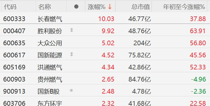A股燃气股逆势上涨,长春燃气、胜利股份涨停