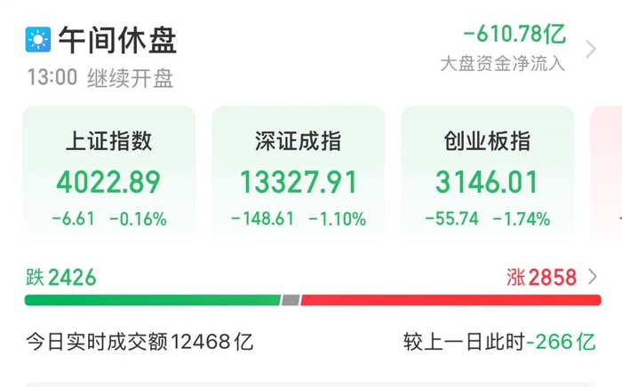 受外围市场全线杀跌影响,11月14日上午,A股市场弱市整理,沪指盘中一度翻红续创十年新高。截至午间收盘,上证指数报4022.89点,跌0.16%;深证成指、创业板指分别跌1.10%、1.74%。沪深北三市半日成交12468亿元。