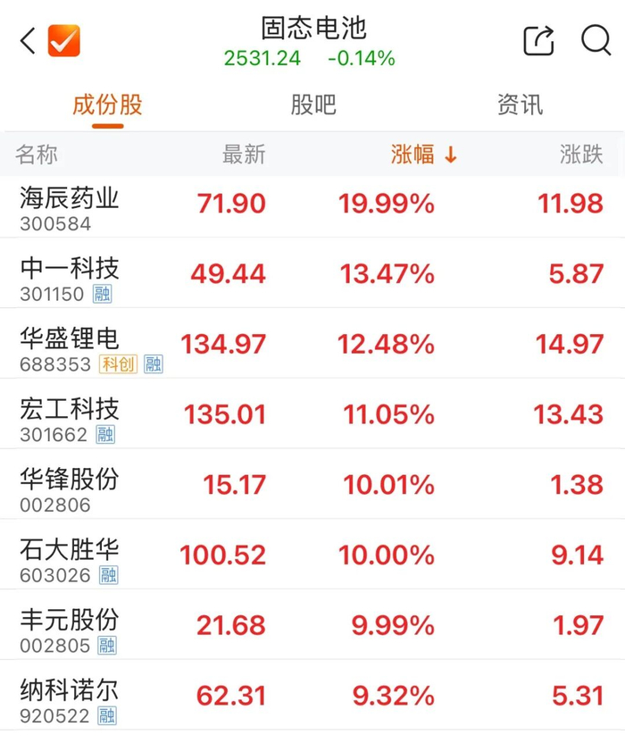 固态电池概念盘中震荡反弹,中一科技、宏工科技涨超10%,华锋股份、石大胜华、丰元股份涨停。