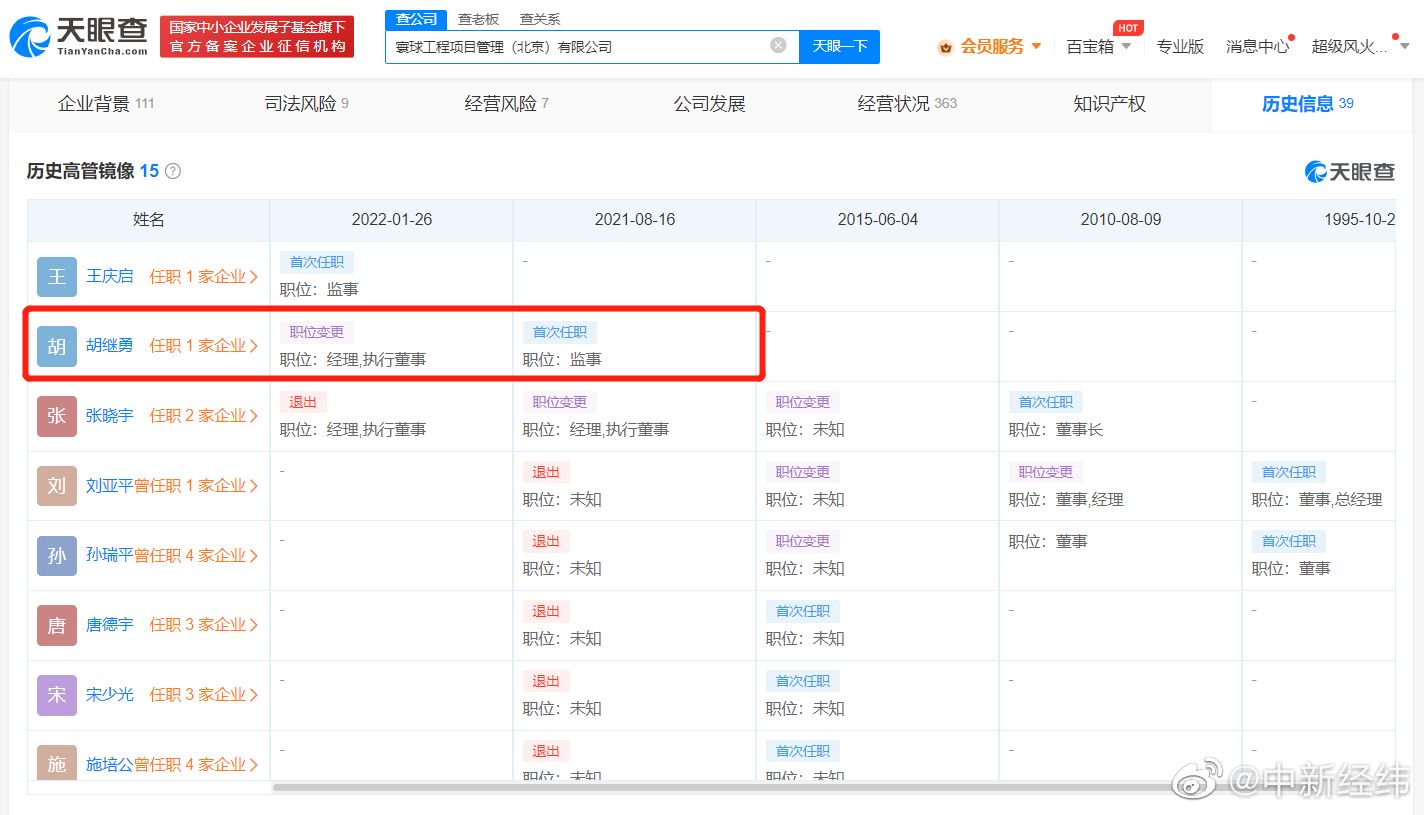 【#胡某勇为中油工程下属公司负责人#】#国企负责人与异性牵手逛街被拍#6月7日,网传一位国企领导与“小三”牵手逛街,被拍到视频并广泛传播。网友指认,该男子疑似寰球工程项目管理(北京)有限公司执行董事、党委书记、总经理胡某勇,中央巡视组值班人员回应媒体称,将督促查实。天眼查App显示,寰球工程项目管理(北京)有限公司成立于1995年10月,注册资本3000万人民币,法定代表人、执行董事、经理为胡某勇,公司经营范围包括工程项目管理、工程监理、工程咨询、工程招标代理等。股东信息显示,该公司由中国石油集团工程有限公司全资持股,后者为中油工程(600339)全资子公司。变更记录显示,2021年8月,胡某勇任该公司监事一职;2022年1月,胡某勇接任该公司法定代表人、执行董事、经理。