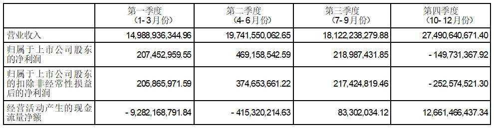 注:公司第四季度生产经营正常,重点工程建设稳步推进,第四季度实现营业收入274.91亿元,占全年营业收入34.22%。第四季度净利润环比下降的原因是:1.公司围绕建设技术先导型工程公司目标,持续提升科技创新能力,加快推动核心技术攻关,第四季度科研项目集中验收和结算,发生研发费用8.72亿元,占全年研发费用的57.00%;2.按照年度减值测试结果及预期信用损失模型计提减值准备,第四季度发生信用和资产减值3.64亿元。