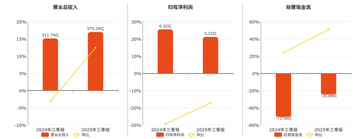 公司营业总收入为575.29亿元,在已披露的同业公司中排名第1,较去年同报告期营业总收入增加63.55亿元,同比较去年同期上涨12.42%。归母净利润为5.23亿元,在已披露的同业公司中排名第5,较去年同报告期归母净利润减少1.09亿元,同比较去年同期下降17.22%。经营活动现金净流入为-35.89亿元,在已披露的同业公司中排名第14,较去年同报告期经营活动现金净流入增加37.27亿元,实现3年连续上涨。