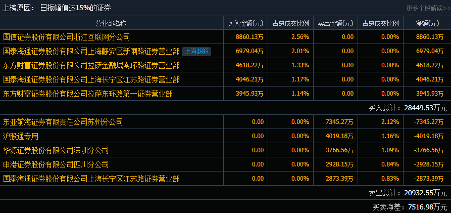 华夏幸福(600340)今日涨9.97%,成交额34.66亿元,换手率28.89%,盘后龙虎榜数据显示,沪股通专用席位卖出4019.18万元。国信证券股份有限公司浙江互联网分公司净买入8860.13万元,上海超短席位净买入6979.04万元,东亚前海证券有限责任公司苏州分公司净卖出7345.27万元。