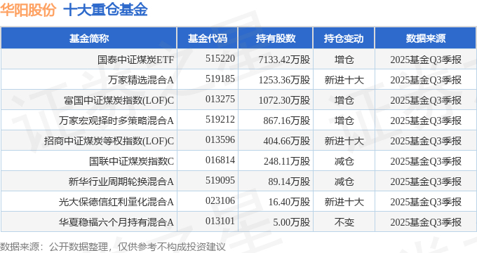 持有华阳股份最多的基金为国泰中证煤炭ETF,目前规模为114.13亿元,最新净值1.192(10月30日),较上一交易日下跌0.68%,近一年上涨4.57%。该基金现任基金经理为吴中昊。
