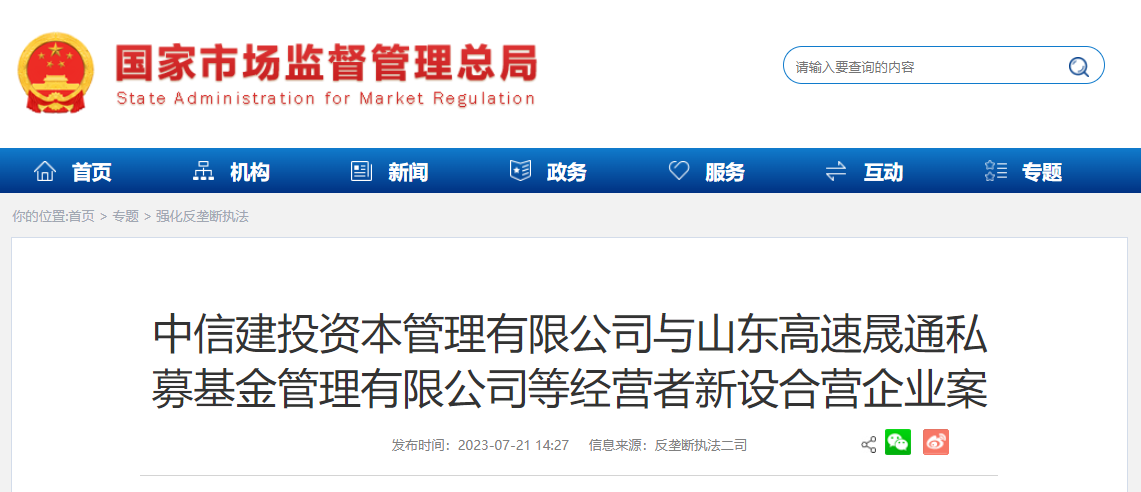 中信建投资本管理有限公司与山东高速晟通私募基金管理有限公司等经营者新设合营企业案