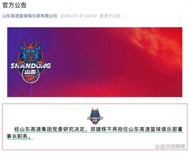 篮球俱乐部有限公司通过其官方微信公号发布公告:经山东高速集团党委研究决定,郑建辉不再担任山东高速篮球俱乐部董事长职务。
