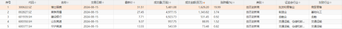 Choice数据统计,今日共有5只个股股价创历史新高,主要分布在金融、交通运输等行业,包括