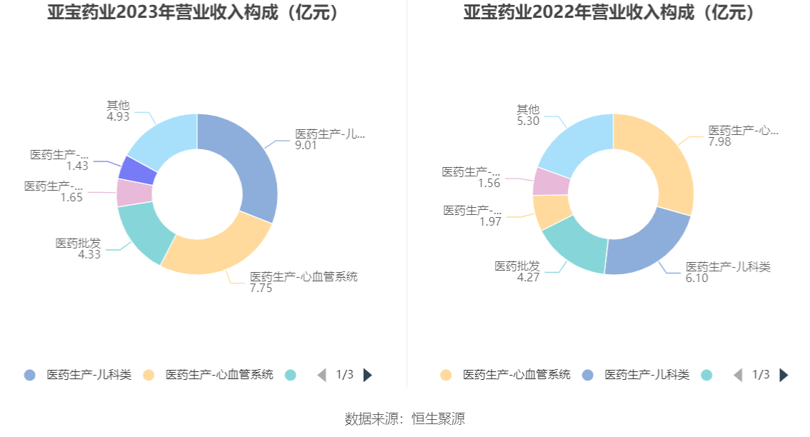 分产品来看,2023年公司主营业务中,医药生产-儿科类收入9.01亿元,占营业收入的30.97%;医药生产-心血管系统收入7.75亿元,同比下降2.91%,占营业收入的26.63%;医药批发收入4.33亿元,同比增长1.45%,占营业收入的14.89%。