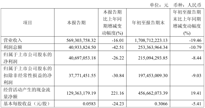 季报内容披露,2025年第三季度,公司实现营业收入5.69亿元,同比减少16.01%;年初至报告期末营收17.09亿元,同比降幅扩大至19.46%。