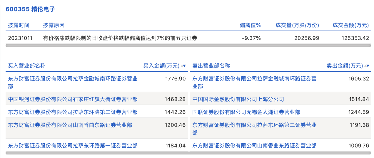 10月11日,精伦电子今日跌9.25%,全天换手率达41.17%,振幅达4.7%。龙虎榜数据显示,营业部席位合计净买入506.04万元。其中,东方财富证券拉萨金融城南环路证券营业部、中国国际金融上海分公司分别卖出1605.32万元、1514.84万元;东方财富证券拉萨金融城南环路证券营业部、中国银河证券石家庄红旗大街证券营业部分别买入1776.90万元、1468.28万元。