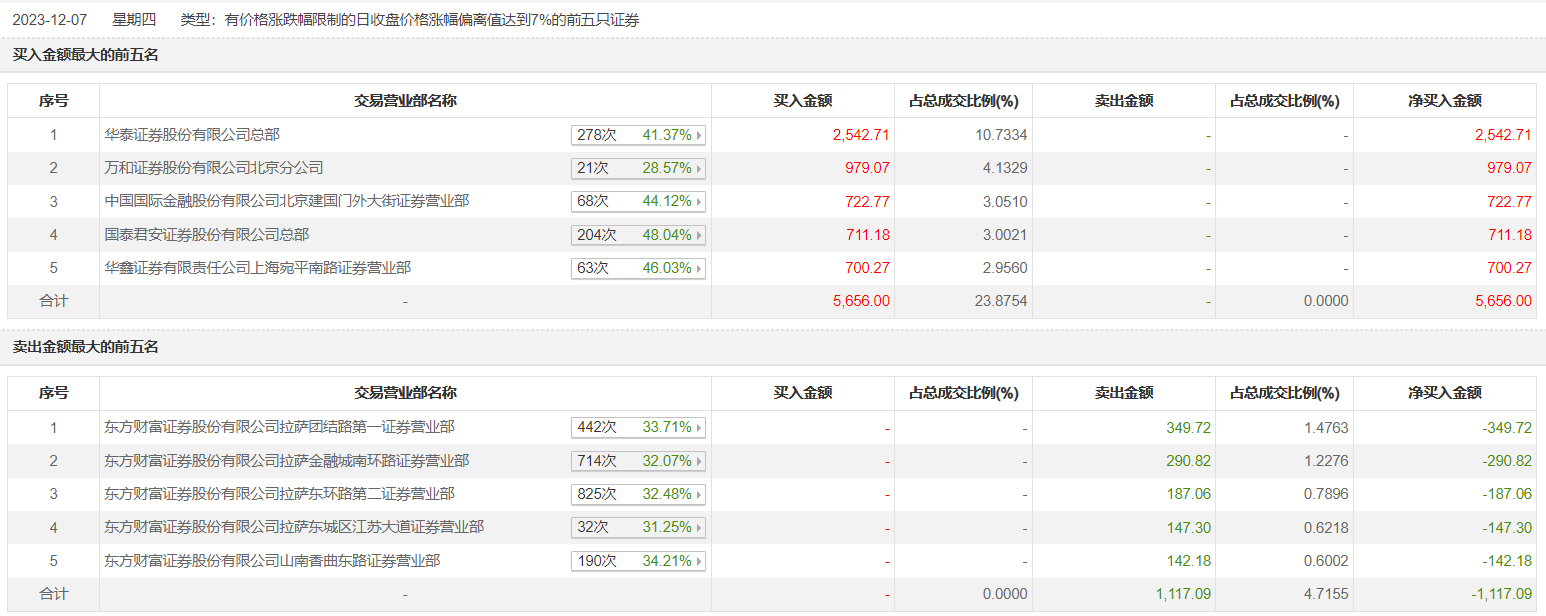 精伦电子12月7日涨停,龙虎榜数据显示,上榜营业部席位全天成交6773.09万元,占当日总成交金额比例为28.59%。其中,买入金额为5656.0万元,卖出金额为1117.09万元,合计净买入4538.91万元。