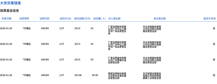 *ST精伦今日大宗交易平价成交199.99万股,成交额413.98万元