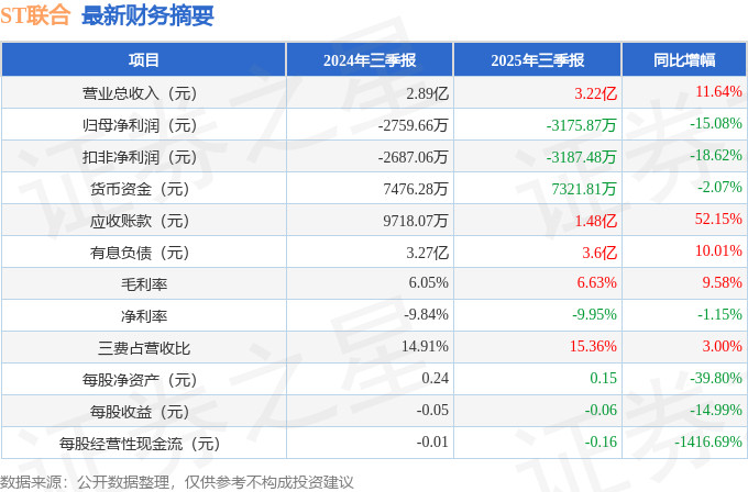 据证券之星公开数据整理,近期ST联合(600358)发布2025年三季报。截至本报告期末,公司营业总收入3.22亿元,同比上升11.64%,归母净利润-3175.87万元,同比下降15.08%。按单季度数据看,第三季度营业总收入1.28亿元,同比上升44.68%,第三季度归母净利润-1563.55万元,同比下降50.63%。本报告期ST联合短期债务压力上升,流动比率达0.97。
