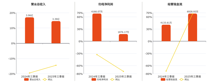 公司营业总收入为3.39亿元,在已披露的同业公司中排名第17,较去年同报告期营业总收入减少9522.98万元,同比较去年同期下降21.95%。归母净利润为1076.17万元,在已披露的同业公司中排名第13,较去年同报告期归母净利润减少2240.95万元,同比较去年同期下降67.56%。经营活动现金净流入为6928.93万元,在已披露的同业公司中排名第14,较去年同报告期经营活动现金净流入增加719.40万元,同比较去年同期上涨11.59%。
