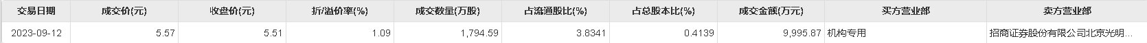 9月12日大宗交易成交1794.59万股,成交额9995.87万元,占当日总成交额的68.74%,成交价5.57元,较市场收盘价5.51元溢价1.09%。